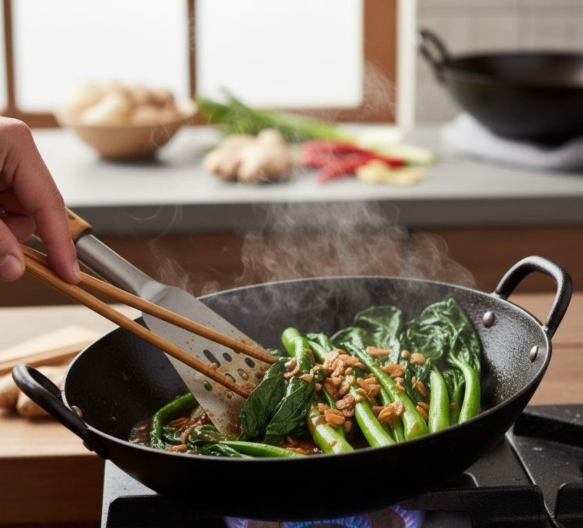 The whole thing takes just 2–3 minutes. I don’t wait for the leaves to collapse completely—just wilt a little. Gai lan can get chewy if cooked too long, so I stop early.